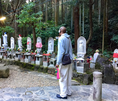Il figlio fa del suo meglio, anche se sta pensando intensamente a un palloncino che ha intravisto in una delle bancarelle... In ogni caso continuiamo a salire, e ci dirigiamo sulla sinistra, dove di fronte a un'altra pagoda si apre una scalinata in cui si trova una serie di divinita' giapponesi preposte alla salvaguardia dei tanti visitatori che si avventurano fin lassu'.